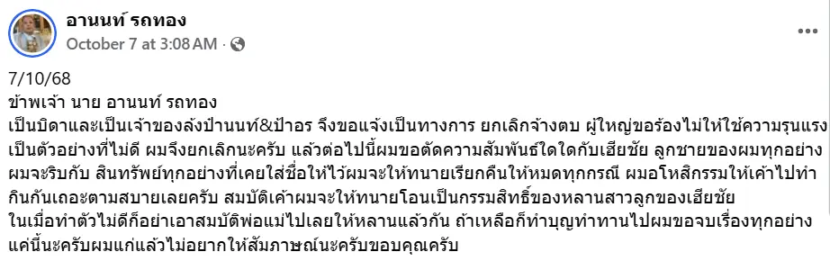 “本人,阿农·罗通,作为父亲及榴莲仓库的业主,现正式宣布:取消雇人打人的决定。